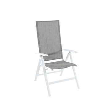 Deze moderne eettafelstoel Chelva heeft een wit aluminium frame met een zitting van grijs textileen. Dit materiaal is zeer onderhoudsvriendelijk en weerbestendig. Bovendien is aluminium van lichtgewicht en daardoor gemakkelijk te verplaatsen. Daarnaast beschikt de stoel over 5 verschillende standen. De Standenstoel Chelva Wit Aluminium is te combineren met andere producten uit de Chelva serie, zoals de eettafel, loungeset en loungestoel. Kortom, een mooie toevoeging aan je moderne tuin!