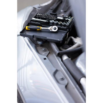 STANLEY COMPACT 37-delige dopsleutelset STMT82672-0 bevat een 1/4" ratel met 72 tanden, waardoor je snel en nauwkeurig kunt sleutelen. De inhoud is zeer gevarieerd, zodat je bijna alle voorkomende sleutel- en schroefklussen in en rondom huis kunt klaren. Inhoud: 10 x doppen met 1/4" aansluiting (5,5 t/m 14mm), 1 verlengstuk 4", 1 bitschroevendraaier met 20 bits (Pozidriv PZ1, PZ2, PZ3. Phillips PH1, PH2, PH3. HEX 3, 4, 5, 6, 7. Slotted 4, 5, 6, 7. Torx TT10, TT15, TT20, TT25, TT27 , TT30 and TT40 ). Alles is opgeborgen in een overzichtelijke cassette, zodat je snel vindt wat je nodig hebt en meteen ziet als er iets ontbreekt.