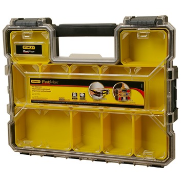 De Stanley Fatmax assortimentsdoos (ondiep) is een ondiepe, zwart met gele opbergkist. De professionele organizer is uitgerust met 10 uitneembare bakjes. Met de organizer bergt u uw materialen snel en overzichtelijk op. Tevens worden uw spullen beschermd van vuil en regenwater. Bovendien kunt u dankzij het transparante, onbreekbare deksel direct de inhoud van de opberger zien. U kunt de organizer stapelen en vergrendelen voor transport, zodat u materialen netjes kunt opbergen en ook onderweg mee kunt nemen.