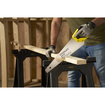 Stanley handzaag 2-15-283 is een universele zaag uit de JetCut serie. Met een gehard en getemperd zaagblad voor een langere levensduur en hoge prestaties. De bimateriale ergonomische handgreep met uitsparing voor je wijsvinger zorgt voor optimaal comfort en controle. De handgreep is bovendien voorzien van aftekenhoeken van 45° en 90°. Elke zaagtand is voorzien van 3 snijvlakken, zodat je ook in achterwaarte beweging hout wegneemt. Hierdoor zaag je veel sneller. De zaag heeft een lengte van 450mm en een vertanding van 7TPI (7 tanden per inch). Dit geeft een wat ruwere afwerking, maar maakt de zaag wel sneller. Het zaagblad heeft een dikte van 1mm en is daardoor lekker stevig.
