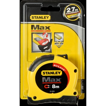 De magnetische Stanley rolbandmaat max 8m (0-33-959) is geschikt voor het meten van metaal en niet-metaal en heeft een gemakkelijk te gebruiken bladvergrendeling. De handige gepatenteerde 'multi-catch' eindhaak is eenvoudig vast te haken voor extra gebruikscomfort. Dankzij de ergonomische behuizing van bimateriaal ligt de rolbandmaat prettig in de hand. De Mylar beschermlaag zorgt ervoor dat de rolbandmaat tot tien keer meer beschermd is tegen slijtage dan andere meetbanden. Het airlock mechanisme beschermt de rolbandmaat tegen schokken en is zeer degelijk in gebruik. De eindhaak van de rolbandmaat geeft de werkelijke nulstand aan, en is duidelijk afleesbaar dankzij de bandbreedte van 28mm.
