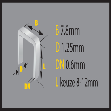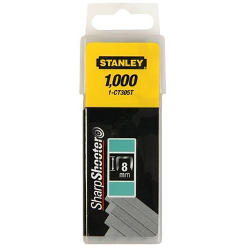 Stanley nieten 1-CT305T zijn ideaal voor het bevestigen kabels, ijzerdraad, gaas, etc. Ze zijn gegalvaniseerd, dus bestand tegen corrosie. Hoogte: 8mm. TYPE CT. Inhoud: 1.000 stuks.