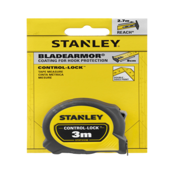 De Stanley Control-Lock STHT37230-0 is een robuuste rolbandmaat met een lengte van 300cm. Het 19mm brede meetlint is aan beide zijden bedrukt, zodat je altijd goed zicht hebt tijdens het meten. De BladeArmor-coating op de eerste 7 cm van het meetllint zorgt voor een verdubbeling van de levensduur en vermindert de kans op breken met 95%. Natuurlijk is deze professionele rolbandmaat voorzien van een eindhaak met een werkelijke nulstand voor nauwkeurige binnen- en buitenmaten. Door de compacte bimateriale behuizing is het nagenoeg onbreekbaar. Voorzien van een handige haak, zodat je 'm aan je broekriem kunt hangen.
