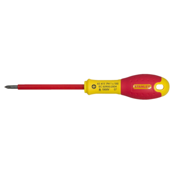 STANLEY FatMax VDE schroevendraaier Phillips 0-65-415 heeft een tip geschikt voor schroeven PH1 en een kling van 100mm lengte. De zwart geoxideerde tip zorgt voor extra bescherming tegen corrosie. De kling is voozien van een polyamide beschermlaag die getest is tot 1000V (EN60900:2004). De handgreep is rechtstreeks op de kling gevormd, waardoor hij nagenoeg onbreekbaar is. De handgreep is smal van voor zodat je snel kunt schroeven en loopt breed uit zodat je ook veel kracht kunt zetten. Het handvat is voorzien van speciale anti-slip rubber waardoor je altijd maximale grip hebt.