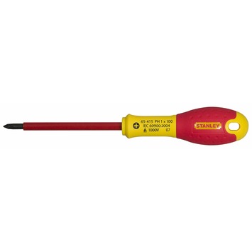 STANLEY FatMax VDE schroevendraaier Phillips 0-65-416 heeft een tip geschikt voor schroeven PH2 en een kling van 125mm lengte. De zwart geoxideerde tip zorgt voor extra bescherming tegen corrosie. De kling is voozien van een polyamide beschermlaag die getest is tot 1000V (EN60900:2004). De handgreep is rechtstreeks op de kling gevormd, waardoor hij nagenoeg onbreekbaar is. De handgreep is smal van voor zodat je snel kunt schroeven en loopt breed uit zodat je ook veel kracht kunt zetten. Het handvat is voorzien van speciale anti-slip rubber waardoor je altijd maximale grip hebt.