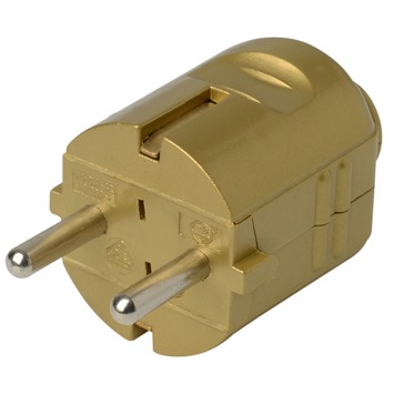 Brons gekleurde stekker met randaarde. De ‘aarde’ zorgt ervoor dat, in geval van kapotte- of losgeschoten bedrading in een apparaat (bv. wasmachine of computer), de metalen delen niet onder stroom komen te staan, de stroom wordt dan via een extra aardedraad in de aarde geleid.