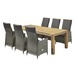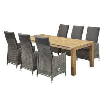 We hadden de loungeset van hetzelfde merk/type al, konden niets anders elders vinden dat qua stijl er net zo mooi bij paste. Zelfs met kortingsactie nog flink aan de prijs vonden wij, maar het is een degelijke stoel en we hopen dat ie lang meegaat. Dat de stoel naar achteren kan is een groot pluspunt. De armleuningen zijn vrij laag en een beetje ruw, maar passen dus wel makkelijk onder een tafel. Ik heb de laatste 3 online besteld, en vervolgens er nog 3 bijgehaald in de winkel (=2x rijden met gemiddelde auto). Aardig wat verpakkingsmateriaal (uit winkel alleen in plastic, bij bezorging ook doos erom heen), sommige kussens waren een beetje verfrommeld maar daar zie je nu niks meer van. Ze kunnen goed tegen een regenspatje, maar bij meer is het toch verstandig om in ieder geval de kussens in een bak of in een hoes te doen (krijg je er niet bij). Ze staan erg mooi en zitten lekker, veel complimenten over gehad. Onze tafel is 1x2 meter, de stoelen passen 3 aan 3 naast elkaar aan de lange zijde van de tafel, maar opstelling zoals op foto is meest comfortabel. Als je brede heuplijn hebt zit deze van alle stoelen in deze serie het beste, als je zwaarder bent dan ca. 100 kilo wordt het evengoed misschien wat krap. De stoel zelf heeft best wat body/gewicht, waardoor hij goed blijft staan ondanks wat wind, het naar voren en achteren schuiven als je erop zit of op wilt gaan zitten gaat wel een tikje moeizaam, ook afhankelijk van de ondergrond natuurlijk.