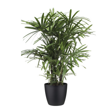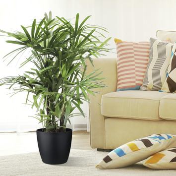 Maar laten we de plant niet vergeten! Deze Rhapis Palm, of ook wel Stokpalm genoemd, heeft bamboeachtige stammen en behoort tot een van de sterkste kamerpalmen die er zijn. Met een gemiddelde hoogte van 110 cm en een potmaat van 27 cm is dit een prima aankleding voor je woning. De plant kan zeer goed tegen een schaduwrijke positie en heeft geen last van luchtvochtigheid, vloerverwarming of licht. Oorspronkelijk komt deze palm uit uit de regenwouden van Zuid-China, maar dankzij GAMMA haal je hem eenvoudig je woonkamer in. In de GAMMA webshop kun je deze plant ook met een soap-, wit- of antraciet kleurige Elho bloempot kopen.