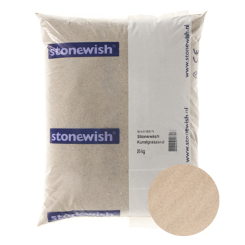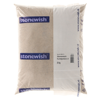 Met Stonewish kunstgraszand 25 kg zorg je voor een goede afwerking na het leggen van kunstgras. Dit instrooizand is speciaal geselecteerd voor gebruik in kunstgras en bestaat uit afgeronde korrels met een korrelgrootte van 0.2 tot 1 mm. Door deze ronde structuur zakt het zand diep tussen de kunstgrassprietjes. Daar ondersteunt het de vezels, waardoor ze beter rechtop blijven staan en minder snel plat gaan liggen.
