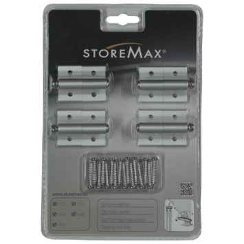 Verander een loze ruimte snel en eenvoudig in een handige opbergplek met de StoreMax clip schuine kap metaal zilver 4 stuk. Niet alleen zijn de clips geschikt om opbergruimtes te creëren, ook kun je ze gebruiken voor het maken van een scheidingswand. Dankzij de schuine kap clips monteer je eenvoudig een schuifwand onder een schuin dak. De clips zijn makkelijk te bevestigen op een vlakke ondergrond, zoals een houten lat. Aan de clips kunnen vervolgens de bovenrails van het schuifdeursysteem worden bevestigd. Kortom: het ideale hulpmiddel om je eigen opbergruimte te maken.