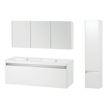 De hoogglans witte Stripe-badkamermeubelset van 120 cm breed is stijlvol en praktisch. Het badkamermeubel komt dankzij de neutrale en eigentijdse vormgeving in de meeste badkamers goed tot zijn recht. Het badmeubel is voorzien van één grote greeploze lade die voorzien is van softclose ladegeleiders voor een zachte en geluidloze sluiting. In de bijpassende spiegelkast met drie deuren die voorzien zijn van softclose scharnieren, vind je ook de nodige ruimte. Achter iedere deur zit een tussenplank waarop je extra toiletartikelen kwijt kunt. Het wastafelblad is vervaardigd uit polybeton. Je krijgt de onderkast en spiegel van de Stripe-badmeubelset voorgemonteerd geleverd. Je monteert het meubel zelf op de muur aan de hand van de bijgesloten montagehandleiding.