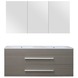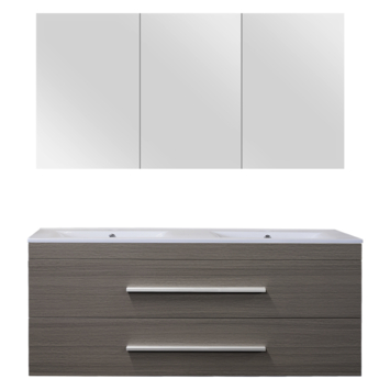 Zoek je een modern en praktisch badmeubel voor jouw badkamer? Deze 120 cm brede Style-badmeubelset in de kleur eiken donkergrijs van GAMMA is eigentijds vormgegeven en biedt voldoende opbergruimte. Het badmeubel is prettig in gebruik dankzij de geleidelijk en stil sluitende laden en spiegeldeuren die zijn uitgevoerd met softclose ladegeleiders en scharnieren. Je sluit en opent de laden met behulp van de fraai vormgegeven aluminium grepen. De badmeubelset van 120 cm breed biedt tegelijkertijd plaats aan twee personen en bestaat uit een onderkast van hoogwaardig MDF, een wastafel met overloop van keramiek en een spiegelkast. De complete badmeubelset is eenvoudig te bevestigen.