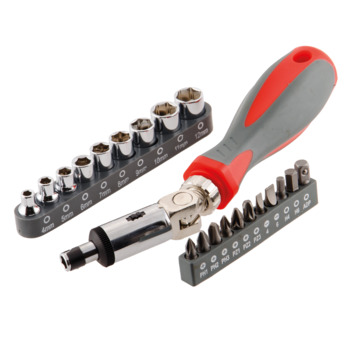 Deze suki bit- en doppenset heeft een magnetische bithouder zodat de bits er niet uitvallen en het handige ratelmechanisme is zowel links- en rechtsom instelbaar maar kan ook vastgezet worden. Het kantelbare handvat maakt werken onder een hoek mogelijk met de verschillende bits met Pozidriv, Philips, sleuf en zeskantaandrijvingen en de schroefdoppen van 4 tot 12mm.