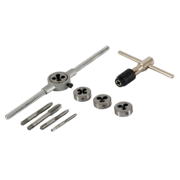 De draadsnij- en tapgereedschapsset M4-8 van suki bestaat uit 10 delen en bevat onder meer een snijmoerhouder, taphouder, tappen, tapkrukken en snijplaten. Kortom, alle onderdelen die nodig zijn om nieuw schroefdraad aan te brengen of beschadigd schroefdraad te herstellen. De suki draadsnij- en tapset is geschikt voor werkzaamheden met metrische schroefdraad M4 tot M8. Het is mogelijk om zowel inwendig als uitwendig schroefdraad in niet-gehard metaal aan te brengen of om beschadigd schroefdraad te herstellen. Naast deze kleine set bevat suki’s assortiment ook een grotere draadsnij- en tapgereedschapsset: M3 tot M12.