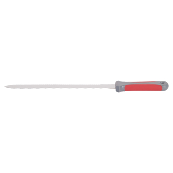 Het suki isolatiemes met een speciaal lemet voor het snijden van diverse isolatiematerialen, zoals steenwol, glaswol en piepschuim. Het 425 millimeter lange isolatiemes heeft een roestvaststalen lemet van 275 millimeter met 2 soorten vertandingen, stevig bevestigd aan een robuuste kunststof greep.