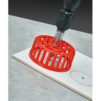 De suki tegelgatsnijder voor probleemloos boren van gaten in tegels met een diameter van 23 tot 94 millimeter, bijvoorbeeld voor het installeren van wandcontactdozen of leidingen. Gebruik een laag toerental, maximaal 400 toeren per minuut en laat de tegelsnijder het werk doen. Het kunststof statief zorgt ervoor dat de boor en het snijmes loodrecht op de tegel komt, dat voorkomt het happen in de tegels. De tegelgatsnijder is met de stelschroef eenvoudig te verstellen. De centerboor en het snijmesje zijn gemaakt van hardmetaal. De tegelgatsnijder is niet geschikt voor het boren van hard gebakken tegels. Hiervoor kun je beter een watergekoelde diamantboor gebruiken