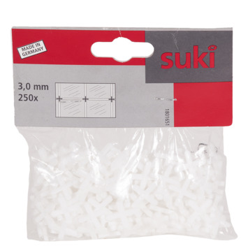 De Suki tegelkruis 3 mm (250 stuks) is een handig hulpmiddel voor het exact uitlijnen van wand- en vloertegels. Plaats de voegkruisjes eenvoudig tussen de tegels en creëer zo een consistente voegbreedte. Dankzij de verpakking van 250 stuks kun je grote oppervlakken betegelen zonder te kort te komen. Deze tegelkruisjes helpen je om een nette en gelijkmatige afwerking te realiseren bij elk tegelsproject.