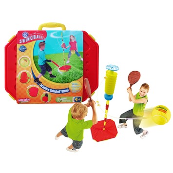 All Surfaces Mookie Swingball set, geleverd in superhandige kunststof draagbox die tevens dient als voet. Rackets, paal en bal eruit, water of zand erin en spelen maar! Of je nu een betegelde binnenplaats hebt of op het strand wil spelen, of binnenshuis... alles kan. Dit speelgoed is geschik voor kinderen vanaf 6 jaar.
