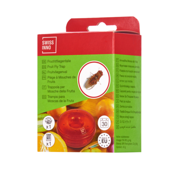 De Swissinno fruitvliegenval incl. lokstof is een herbruikbare val gemaakt van robuust kunststof en bestaat uit 2 delen. De speciaal ontwikkelde lokstof trekt insecten en fruitvliegen aan. Door de transparante afdekking en het beschikbare licht worden de insecten in de val getrokken. Bijbehorende navulling is los verkrijgbaar in ons assortiment.