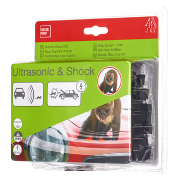 De Swissinno marter verdrijver voor auto's geeft sterke ultrageluid- trillingen en heeft opgeladen hoogspanningsplaatjes die de marter uit de motorruimte verdrijven. Deze verdrijver is preventief te gebruiken tegen schade aan de auto door marters. Een goede manier om de marter te verdrijven zonder gif of chemicaliën. De marter stop kan direct aan de accu van de auto aangesloten worden en schakelt bij een accuspanning van 11,8 V of lager direct uit. Dit Zwitsers kwaliteitsproduct is spatwaterdicht , diervriendelijk, verdrijft de marter maar brengt het dier geen schade toe.