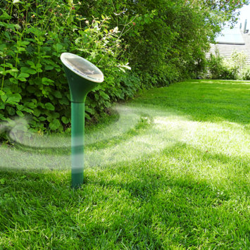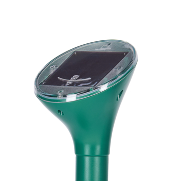 De Swissinno mollen- / knaagdier verdrijver SolarCat geeft elke 40 seconden geluidsgolven en trillingen af die de mol, woelmuis, en andere knaagdieren verdrijft. De verdrijver werkt in een oppervlakte van 650 m² en is gemakkelijk in te zetten op sportvelden, parken, golfbanen en is zeer geschikt voor de tuinen en gazons. De verdrijver heeft een ingebouwd zonnepaneel dat de zonnestralen omzet in elektriciteit om de batterij op te laden, waardoor het apparaat 24/7 ingeschakeld is. Deze mollen verdrijver is waterdicht en kan buiten in regen of sneeuw gezet worden.