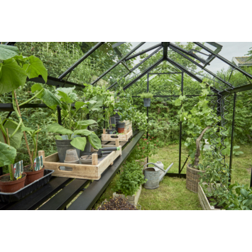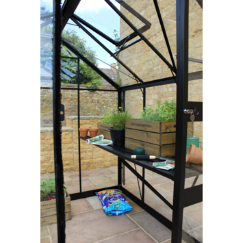 Deze zwarte geïntegreerde aluminium kweektafel is precies passend leverbaar voor de Birdlip 44. De lengte van de tafel is gelijk aan de binnenmaat van de langste zijde van de kas. De hoogte is instelbaar is voor een optimale werkhouding, dus zaaien en kweken op stahoogte! De tafel heeft een breedte van 40 cm breed.