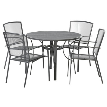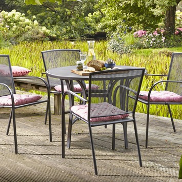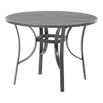 De tafel Mesh is een antracietkleurige tuintafel. De tafel is gemaakt van metaal en is dus heel duurzaam en onderhoudsvriendelijk. Hij heeft een rond tafelblad van 1 meter doorsnede en is 71 centimeter hoog. De tafel past op veel plaatsen en is door zijn afmeting ook te gebruiken als eettafel. Er passen gemakkelijk vier stoelen rondom deze tafel.