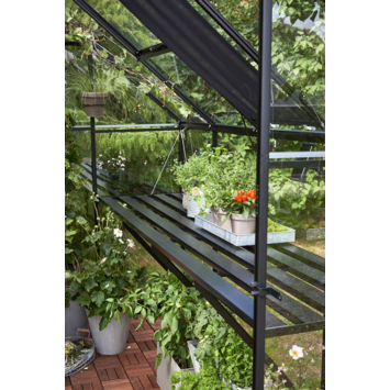 Deze zwarte geïntegreerde aluminium kweektafel is precies passend voor de tuinkas Qube 66. De lengte van de tafel is gelijk aan de binnenmaat van de zijgevel van de kas en is voorzien van dezelfde zwarte coating als de kas. De hoogte is instelbaar voor een optimale werkhouding.