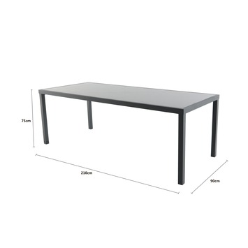 De tuintafel is 210 centimeter lang, 90 centimeter breed en 75 centimeter hoog.
