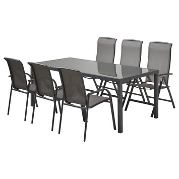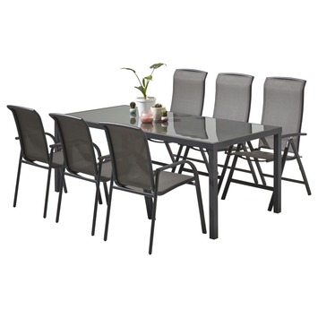 Ben jij op zoek naar een rechthoekige, strakke en moderne eettafel voor in je tuin? Ga dan voor de Tafel Toledo Grijs Aluminium 210x90x75 cm! Het frame van deze buitentafel is gemaakt van aluminium, een sterk materiaal dat licht van gewicht, makkelijk schoon te maken én weerbestendig is. Het tafelblad is van grijs glas en tevens onderhoudsvriendelijk en bestand tegen weer. De tuintafel is overigens verkrijgbaar in meerdere maten. Daarnaast zijn uit de serie Toledo bijpassende stoelen voor aan de tafel verkrijgbaar, waarmee je tuinset er als een geheel uitziet.