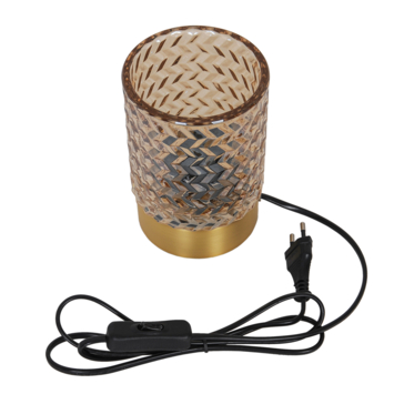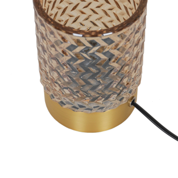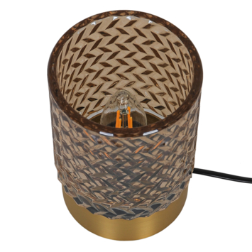 Tafellamp Kim heeft een goudkleurige metalen voet en een cilindervormige lampenkamp van doorzichtig glas. Als de lamp brandt geeft dit glas een mooi effect op de tafel.