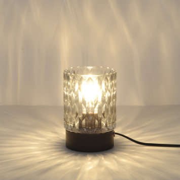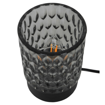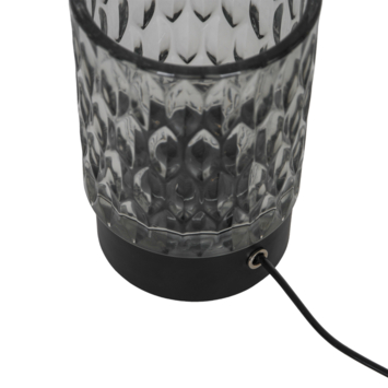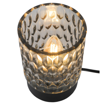 Tafellamp Kim heeft een zwartkleurige metalen voet en een cilindervormige lampenkamp van doorzichtig glas. Als de lamp brandt geeft dit glas een mooi effect op de tafel.