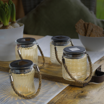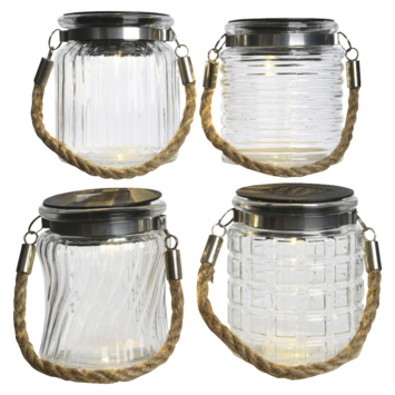 Creëer een gezellige sfeer op de buitentafel met deze weckpotjes. Boven op de weckpot zit een zonnepaneel wat een totale lichtopbrengst geeft van 6 uur. Zorg ervoor dat de weckpot voldoende licht krijgt en de warm witte LED lamp in de weckpot geeft een sfeervol licht. De weckpotjes zijn verkrijgbaar in 4 verschillende dessins. Hierdoor kan je er op je tafel ook een mix van maken. Aan iedere lamp is een touw bevestigd waardoor je ze ook kunt ophangen in de boom of aan de schutting.