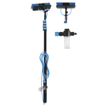 De geïntegreerde zeepdispenser mengt reinigingsmiddel direct met water. Dat bespaart tijd en zorgt voor een gelijkmatige verdeling tijdens het borstelen. De verstelbare hoekadapter maakt het mogelijk om de borstel in meerdere standen te gebruiken. De meegeleverde slang heeft dezelfde lengte als de volledig uitgeschoven steel, wat prettig werkt.