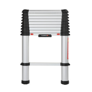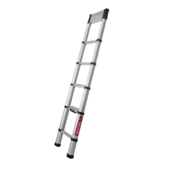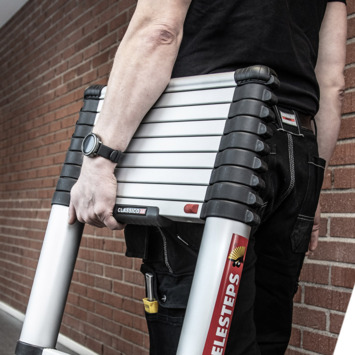 Deze Telesteps Telescoopladder Classico Line 9 Treden is compact op te bergen en toepasbaar voor uitleenlopende werkzaamheden. Wanneer de trap helemaal is ingeschoven heeft deze een lengte van 75 cm waarmee deze telescopische ladder zeer praktisch is om op te bergen. De uitschuiflengte van de ladder bedraagt 3,0 meter. Deze telescopische ladder heeft 9 treden die variabel in te stellen zijn tot een maximale werkhoogte van 3,8 meter en heeft een comfortabel stavlak. Met een draaggewicht van maximaal 150 kilo en met zijn antisliptreden is deze trap robuust en veilig. De treden vergrendelen zichzelf tijdens het uitschuiven van de ladder en zijn door middel van ontgrendelknoppen weer in elkaar te klappen. Met dit systeem kunnen uw vingers niet tussen de treden komen en kunt u de trap veilig inklappen.