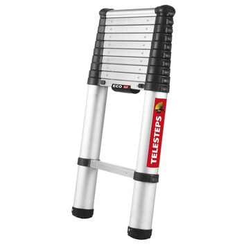 Deze Telesteps Telescoopladder Eco 10 Treden is compact op te bergen en toepasbaar voor uitleenlopende werkzaamheden. Wanneer de trap helemaal is ingeschoven heeft deze een lengte van 77 cm waarmee deze telescopische ladder zeer praktisch is om op te bergen. Deze telescopische ladder heeft 10 treden die variabel in te stellen zijn tot een maximale werkhoogte van 4,4 meter en heeft een comfortabel stavlak. Met een draaggewicht van maximaal 150 kilo en met zijn antisliptreden is deze trap robuust en veilig. De treden vergrendelen zichzelf tijdens het uitschuiven van de ladder en zijn door middel van ontgrendelknoppen weer in elkaar te klappen. Met dit systeem kunnen uw vingers niet tussen de treden komen en kunt u de trap veilig inklappen.