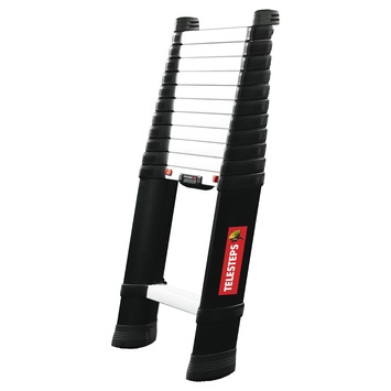 Deze Telesteps Telescoopladder Prima 12 Treden is compact op te bergen en toepasbaar voor uitleenlopende werkzaamheden. Wanneer de trap helemaal is ingeschoven heeft deze een lengte van 87 cm waarmee deze telescopische ladder zeer praktisch is om op te bergen. De uitschuiflengte van de ladder bedraagt 3,8 meter. Deze telescopische ladder heeft 12 treden die variabel in te stellen zijn tot een maximale werkhoogte van 5,0 meter en heeft een comfortabel stavlak. Met een draaggewicht van maximaal 150 kilo en met zijn antisliptreden is deze trap robuust en veilig. De treden vergrendelen zichzelf tijdens het uitschuiven van de ladder en zijn door middel van ontgrendelknoppen weer in elkaar te klappen. Met dit systeem kunnen uw vingers niet tussen de treden komen en kunt u de trap veilig inklappen.