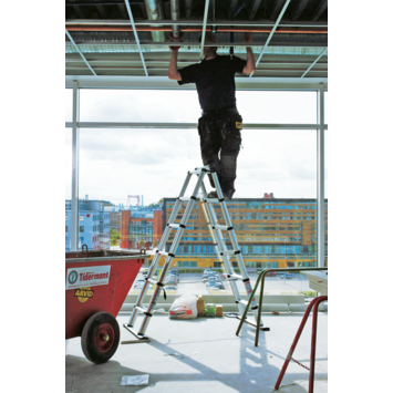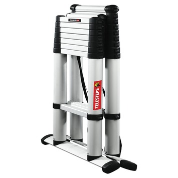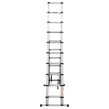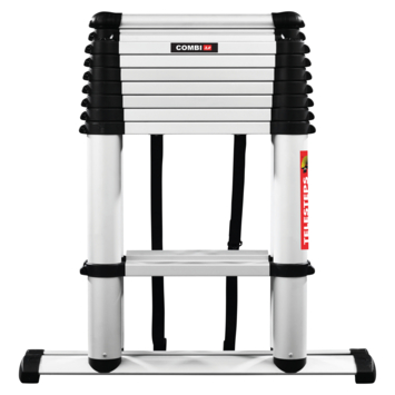Deze Telesteps Telescoopladder Combi Line 10 Treden is compact op te bergen en toepasbaar voor uitleenlopende werkzaamheden. Wanneer de trap helemaal is ingeschoven heeft deze een lengte van 78 cm waarmee deze telescopische ladder zeer praktisch is om op te bergen. Deze telescopische ladder heeft 10 treden die variabel in te stellen zijn tot een maximale werkhoogte van 4,2 meter en heeft een comfortabel stavlak. Met een draaggewicht van maximaal 150 kilo en met zijn antisliptreden is deze trap robuust en veilig. De treden vergrendelen zichzelf tijdens het uitschuiven van de ladder en zijn door middel van ontgrendelknoppen weer in elkaar te klappen. Met dit systeem kunnen uw vingers niet tussen de treden komen en kunt u de trap veilig inklappen.