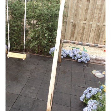 Deze Terrastegel Rubber Zwart 40x40 cm - 240 Tegels / 38,40 m2 is een rubbertegel waarop je kinderen veilig kunt laten spelen. De rubbertegel is waterdoorlatend dankzij de speciale onderkant met noppen. Hierdoor vloeit water makkelijk weg. Rubbertegels zijn een veilige oplossing voor spelende kinderen. Ze beschermen tot een valhoogte van 0,9 m. Hierdoor is de rubbertegel geschikt om bijvoorbeeld onder speeltoestellen te leggen. Daarnaast kunt je met de tegel je tuin, balkon of dakterras aanleggen. De tegel, die op een pallet wordt geleverd, is namelijk niet alleen waterdoorlatend, maar ook eenvoudig op maat te snijden. De antisliplaag voorkomt dat jij of je kinderen uitglijden wanneer de tegels nat zijn geworden. Aan de zwarte rubberen tegels beleven zowel jij als je kinderen dan ook veel plezier.