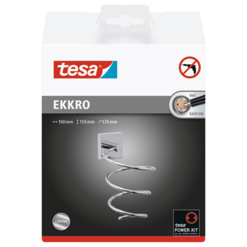 De tesa® Ekkro haardrogerhouder in hoogglans chroom biedt een stijlvolle en praktische oplossing voor het organiseren van je haarstylingspullen. Deze houder houdt je föhn altijd binnen handbereik en zorgt ervoor dat je badkamer er netjes uitziet. Dankzij de innovatieve tesa® Power.Kit technologie monteer je de houder eenvoudig: plak de adapter op de muur, vul deze met de bijgeleverde lijm en laat het 12 uur uitharden. Vervolgens bevestig je de houder zonder gedoe. De houder is ook gemakkelijk te verwijderen zonder lijmresten achter te laten en kan opnieuw worden bevestigd met een aparte adapter set. Deze houder is geschikt voor diverse oppervlakken zoals tegels, metaal en glas, maar niet voor behang of stucwerk. Creëer een georganiseerde en moderne uitstraling met deze praktische haardrogerhouder.