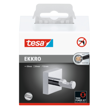 Met de tesa® Ekkro handdoekhaak hang je handdoeken op zonder gaten te boren. Het hoogglans verchroomde metaal geeft de badkamer of toiletruimte een moderne uitstraling. Door de tesa® Power.Kit technologie monteer je de haak snel en eenvoudig. Plak de adapter op een schone muur, vul hem met de meegeleverde lijm en wacht 12 uur. Daarna schroef je de haak vast. Alle onderdelen die je nodig hebt, zitten in de verpakking. Wil je de haak later verwijderen? Dit kan zonder resten achter te laten. Met een nieuwe adapter gebruik je de haak opnieuw op een andere plek. De haak hecht stevig op oppervlakken zoals tegels, natuursteen en glas. Behang en stucwerk zijn niet geschikt. Zo blijft de ruimte netjes en heb je altijd een plek voor je handdoek binnen handbereik.