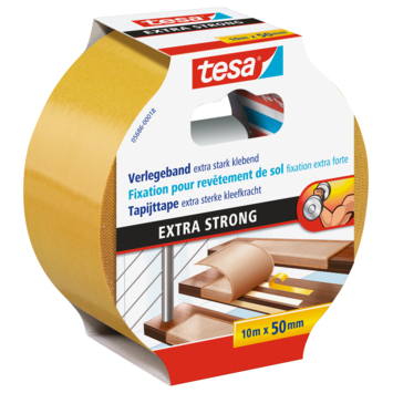 Tesa tapijttape extra sterk 10 m x 50 mm geel is een krachtige dubbelzijdige tape die je gebruikt voor het bevestigen van vloerbedekking op moeilijke oppervlakken binnen. Hij is geschikt voor alle soorten tapijt en PVC en blijft goed hechten op plekken zoals trappen of overdekte buitenvloeren. De tape zorgt voor een stevige bevestiging en voorkomt verschuiven, ook bij intensief gebruik.