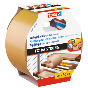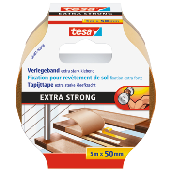 Tesa Extra Sterk tapijttape geel 5 m x 50 mm is een dubbelzijdige tape voor het bevestigen van tapijt of PVC-vloeren op effen en oneffen ondergronden binnen. De tape is gemaakt van kunststof met een stevige PE-structuur die zorgt voor extra hechting. Je gebruikt hem op plekken waar andere tapes het lastig hebben zoals trappen of overdekte buitenruimtes. Dankzij de sterke kleeflaag blijft het tapijt goed vastzitten, zelfs bij intensief gebruik.