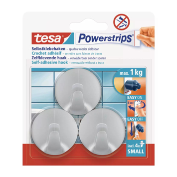 De Tesa Haak Powerstrip Rond Kunststof Chroom - 3 Stuks is gemaakt van een hoge kwaliteit glanzende chroomkleurige kunststof. Je kunt deze haken monteren zonder te boren of schroeven dankzij de Tesa Powerstrips technologie. Hiermee plak je ze eenvoudig op een gladde ondergrond. De haken hebben een draagkracht van 1 kg per stuk. Je kunt de haken gebruiken op tegels, glas, hout, plastic en andere gladde ondergronden (ze zijn niet geschikt voor gebruik op geschuimd en poreus materiaal). Dankzij de Powerstrips Small van Tesa kun je de haken opnieuw gebruiken. Je verwijdert ze zonder een spoor achter te laten op de ondergrond. De chroomkleurige trendy, ronde haakjes kun je op veel plaatsen toepassen. De haken zijn ook verkrijgbaar in een ander formaat of in een andere kleur. De ronde Tesa Powerstrip haken worden per 3 stuks verkocht.