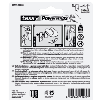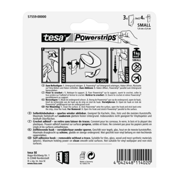 De Tesa Powerstrip haken zijn gemaakt van een hoge kwaliteit witte kunststof. Je kunt deze haken monteren zonder te boren of schroeven dankzij de Tesa Powerstrips technologie. Hiermee plak je ze eenvoudig op een gladde ondergrond. De haken hebben een draagkracht van 1 kg per stuk. Je kunt de haken gebruiken op tegels, glas, hout, plastic en andere gladde ondergronden (ze zijn niet geschikt voor gebruik op geschuimd en poreus materiaal). Dankzij de Powerstrips Large van Tesa kun je de haken opnieuw gebruiken. Je verwijdert ze zonder een spoor achter laten op de ondergrond. De haken hebben een trendy ontwerp in wit kunststof. De haken zijn tevens verkrijgbaar in een kleiner formaat of in een andere kleur. De Tesa Haak Powerstrip Wit Kunststof - wordt per 3 stuks verkocht.