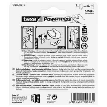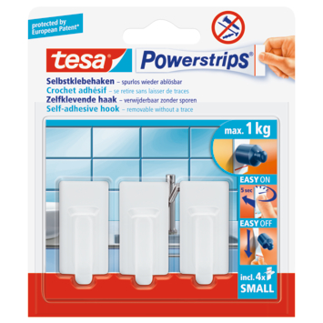De Tesa Haak Powerstrip Wit Kunststof - 3 Stuks is gemaakt van een hoge kwaliteit witte kunststof. Je kunt deze haken monteren zonder te boren of schroeven dankzij de Tesa Powerstrips technologie. Hiermee plak je ze eenvoudig op een gladde ondergrond. De haken hebben een draagkracht van 1 kg per stuk. Je kunt de haken gebruiken op tegels, glas, hout, plastic en andere gladde ondergronden (ze zijn niet geschikt voor gebruik op geschuimd en poreus materiaal). Je verwijdert ze zonder een spoor achter te laten op de ondergrond en kunt ze opnieuw gebruiken. De Classic haken hebben een tijdloos ontwerp. De haken zijn ook beschikbaar in een ander formaat of in een andere kleur. De kleine Tesa Powerstrip haken worden per 3 stuks verkocht.