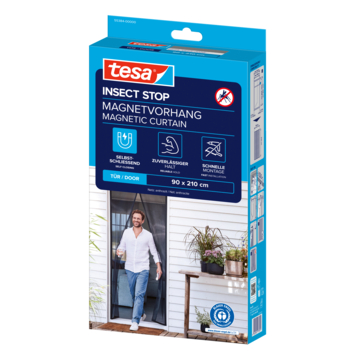 Bescherming tegen insecten was zelden zo eenvoudig. Om te voorkomen dat terras- en balkondeuren een toegangspoort voor muggen worden, heeft tesa dit zelfsluitende magnetische gordijn ontwikkeld. De 30 magneten die in het gordijn zijn genaaid, zijn handig: Het deurgordijn gaat moeiteloos open en dicht. De magnetische functie is vooral handig in huishoudens met kinderen of als u een huisdier hebt. De brede zelfklevende tape kan op de gewenste maat worden geknipt. Zelfs onervaren gebruikers zijn in staat om het gordijn eenvoudig en snel te installeren zonder te boren.