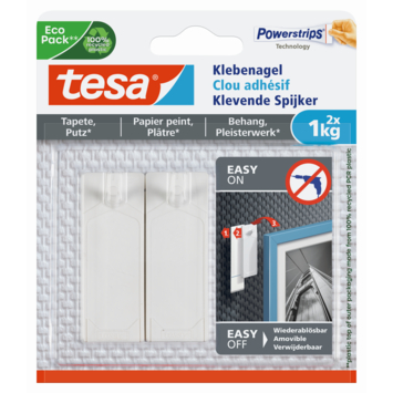 Tesa klevende spijkers behang en pleisterwerk 1 kg 2 stuks en de meegeleverde klevende strips zijn speciaal ontwikkeld om voorwerpen eenvoudig te monteren met stevige hechting op oneffen en gevoelige oppervlakken. De klevende spijkers hebben een draagkracht van max. 1 kg per spijker. Tesa klevende spijkers behang en pleisterwerk 1 kg 2 stuks vormen een handige manier om decoratie op te hangen zonder schade te veroorzaken en zonder gedoe met hamer of boor. Dankzij de powerstrips technologie zijn ze eenvoudig in het gebruik en kunnen ze worden verwijderd zonder spoor. Je kunt de klevende spijker opnieuw gebruiken met een nieuwe klevende strip.