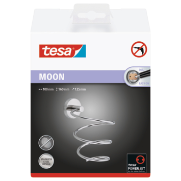 Met de tesa® Moon haardrogerhouder krijgt je föhn een vaste plek. De houder is van rvs en heeft een speciale coating die vlekken en vingerafdrukken tegengaat. Zo blijft hij netjes. Bevestigen gaat zonder boren. Plak de adapter op de muur, vul hem met de meegeleverde lijm en wacht 12 uur. Daarna draai je de houder vast. De föhn hangt stevig en is altijd binnen handbereik. Wil je de houder verplaatsen? Dan haal je hem makkelijk weg zonder sporen. Met een nieuwe adapter zet je hem zo op een andere plek. De houder hecht goed op gladde muren zoals tegels, hout en glas. Behang en stucwerk kun je beter vermijden. Hij bespaart ruimte en voorkomt rondslingerende snoeren. Alles wat je nodig hebt voor de montage zit erbij.
