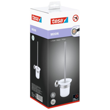 De tesa® Moon toiletborstelset biedt een stijlvolle en praktische oplossing voor je toiletruimte. Dankzij de RVS afwerking met anti-vingerafdruk blijft de set altijd netjes en schoon, terwijl het gesatineerde glas een luxe uitstraling geeft. De toiletborstel neemt geen kostbare vloeroppervlakte in beslag, want je bevestigt hem eenvoudig aan de muur. Het monteren gaat snel en gemakkelijk met de tesa® Power.Kit technologie: plak de adapter op de muur, vul deze met de speciale lijm, laat het 12 uur uitharden en schroef dan de houder vast. De set bevat alles wat je nodig hebt, inclusief een toiletrolhouder en bevestigingsmaterialen. De houder is ook eenvoudig te verwijderen zonder lijmresten achter te laten, en je kunt hem opnieuw bevestigen met een aparte adapterset. Deze set is geschikt voor diverse ondergronden zoals tegels en glas, maar niet voor behang of stucwerk.